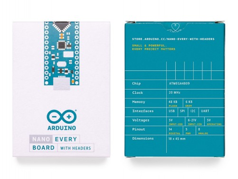 Nano Every jest najprostszym rozwiązaniem z nowej serii. Nie zawiera żadnego czujnika i rozwiązania łączności, a niezależnie jest znacznie mocniejszy od standardowego Nano (aż o 50% więcej pamięci programu i 2 razy więcej pamięci RAM). Płytka kompatybilna z Arduino 5V w najmniejszej dostępnej obudowie 45mm x 18mm! Posiada 30 pinów, po 15 na każdej stronie. Arduino Nano jest preferowaną płytką w wielu projektach wymagających małej i prostej w użyciu płytki mikrokontrolera. Niewielkie rozmiary i niska cena sprawiają, że Nano Every szczególnie nadaje się do projektów małych urządzeń o bardziej zaawansowanych funkcjach, takich jak przetwarzanie dźwięku czy robotyka. Sercem płytki jest procesor ATmega4809 AVR. Mikrokontroler jest znacznie mocniejszy od mikrokontrolera w zwykłym Nano, ale z drugiej strony mniej popularny na rynku, co wiąże się z mniejszą dostępnością materiałów i bibliotek, zwłaszcza z urządzeniami peryferyjnymi.