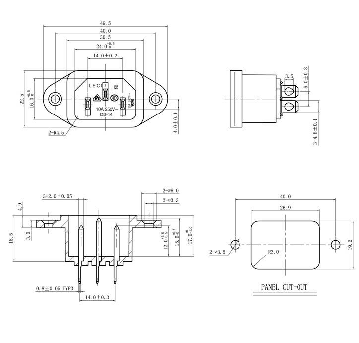 • Gniazdo AC IEC męskie do obudowy z klapką