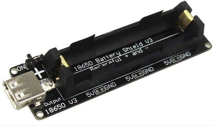 Arduino battery 18650 shield obsługuje 1 akumulator 18650 o dowolnej pojemności. Posiada wbudowaną przetwornicę zmieniającą napięcie do 3V oraz do 5V. Dzięki złączu micro USB można ładować ogniwa kablem USB prosto z portu USB komputera lub ładowarki zakończonej wtykiem micro USB.