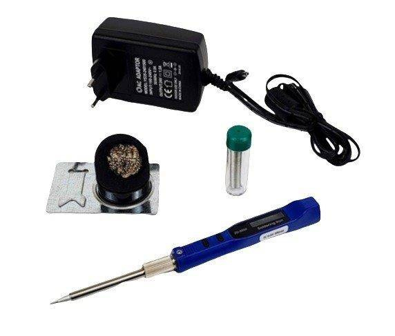 Lutownica o mocy 30W zasilana z z zasilacza 24V. Dzięki elektronicznemu sterowaniu możemy precyzyjnie ustawić temperaturę grota z dokładnością do 1°C. Lutownica posiada cienki, stożkowy grot dzięki któremu możemy lutować nawet drobne elementy oraz posiada możliwość wymiany grota na inne modele. Kolba rozgrzewa się do temperatury 150°C-450°C w czasie ok 15 sekund. Nagrzewanie następuje od razu po podłączeniu zasilania. Przyciskami "+" oraz "-" ustawiamy zakładaną temperaturę grota. Po chwili na wyświetlaczu wyświetli się aktualna temperatura jaką posiada grot. Do zestawu dołączona jest również podstawka pod lutownicę, czyścik do czyszczenia grotów oraz cyna w fiolce.