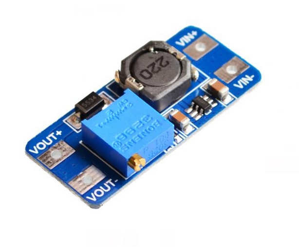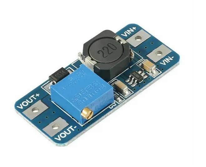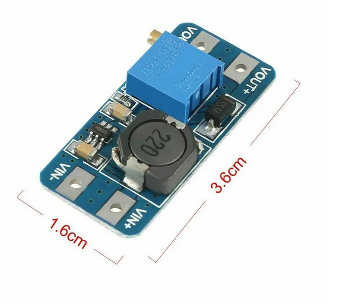 Przetwornica podwyższa napięcie wejściowe z zakresu 2V - 24V do napięcia wyjściowego regulowanego za pomocą potencjometru z zakresu 4V - 28V.