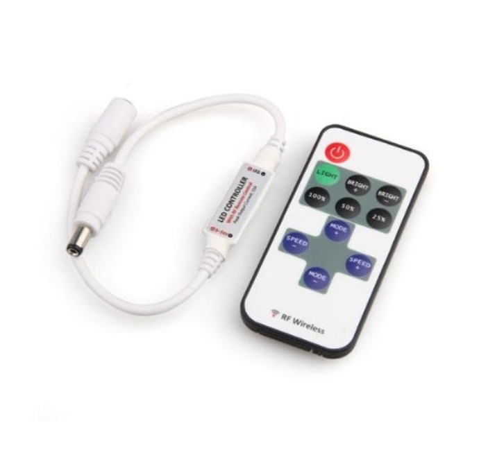 Sterownik do jednokolorowych taśm LED umożliwia regulowanie natężenia światła od 0% do 100%) lub szybkie wybranie odpowiedniego stopnia natężenia (25%, 50%, 100%).