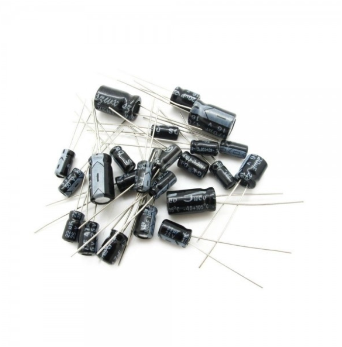 Zestaw 12 najpopularniejszych wartości kondensatorów elektrolitycznych na różne napięcia, używanych przez każdego elektronika.