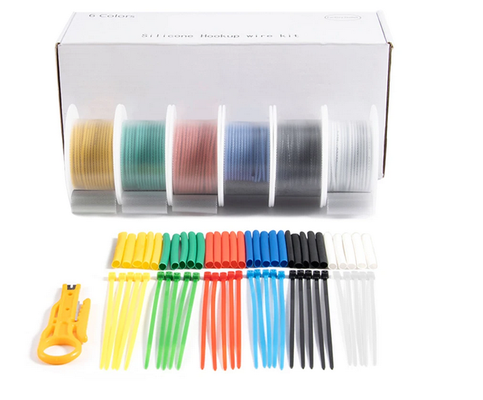 Zestaw 6szt przewodów drucianych w silikonowej izolacji. Każdy przewód nawinięty jest na szpulce dzięki czemu nie poplącze się.