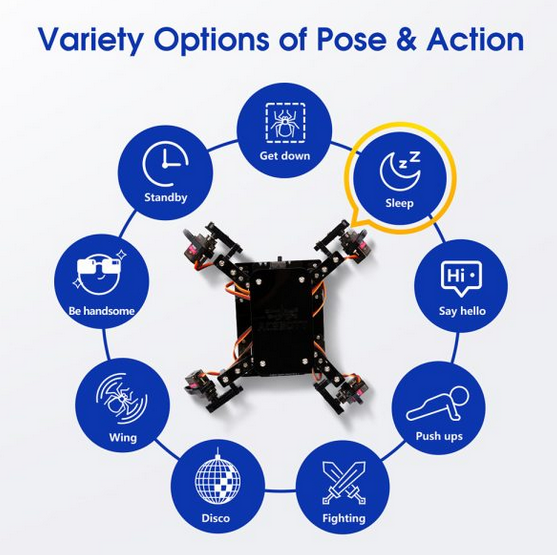 Wykorzystuje płytę sterującą ESP8266 i jest wyposażony w osiem silników sterujących mg90 dla większej dokładności i niezawodności.