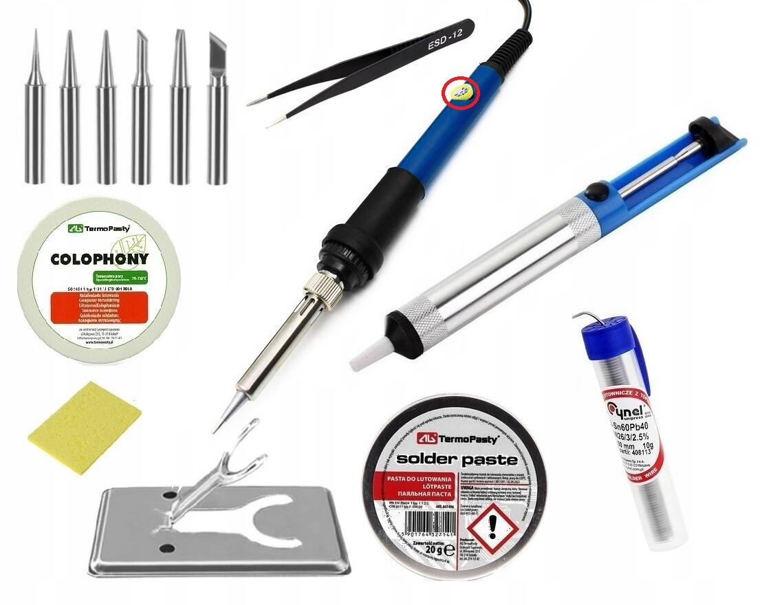 - Zestaw Lutownica kolbowa 60W + groty, podstawka, odsysacz, cyna 14 elementów