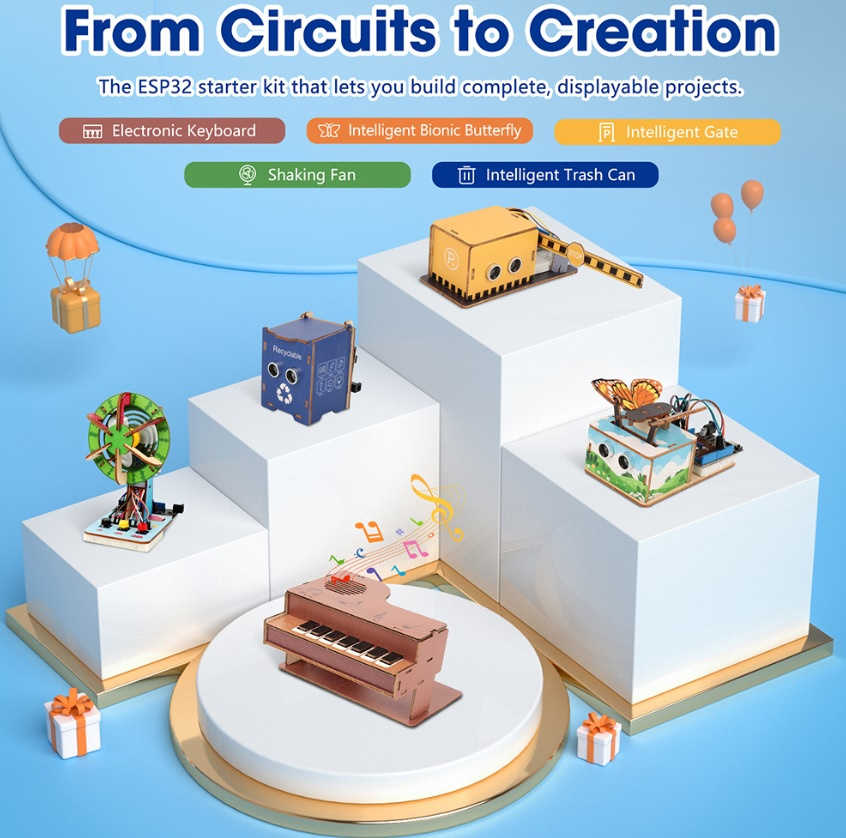 Wooden Board for ESP32 (QE201)” to moduły konstrukcyjne, panele drewniane wykonane ze sklejki, elementy obudowy do zestawu edukacyjnego ESP32 QE200.