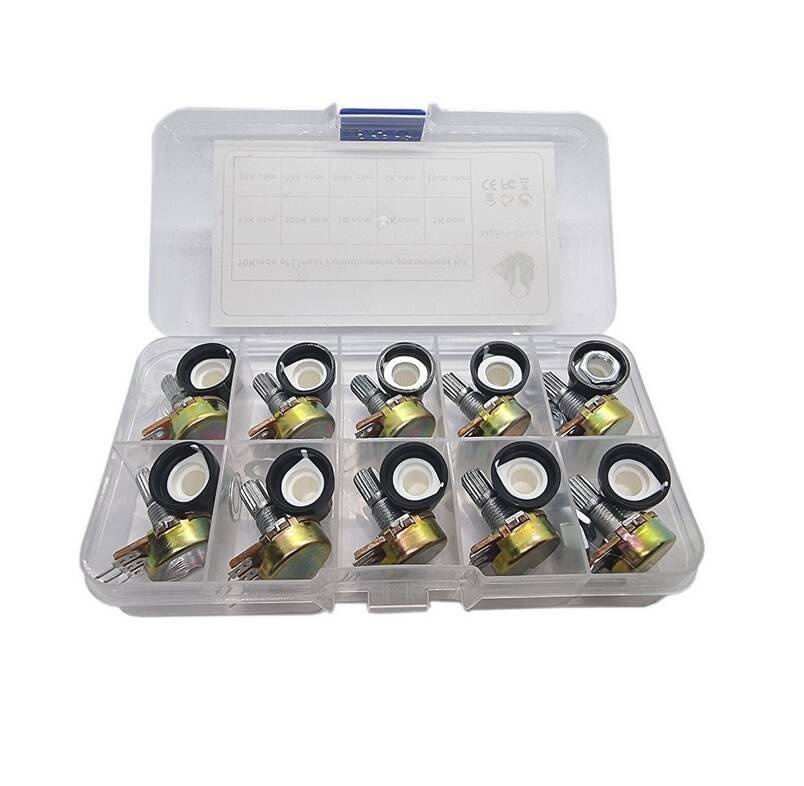 - Zestaw potencjometrów 0.125W + gałki - 20szt. (1K, 2K, 5K, 10K, 20K, 50K, 100K, 250K, 500K, 1M Ohm + gałki x10szt, podkładki x10szt, nakrętki x10szt