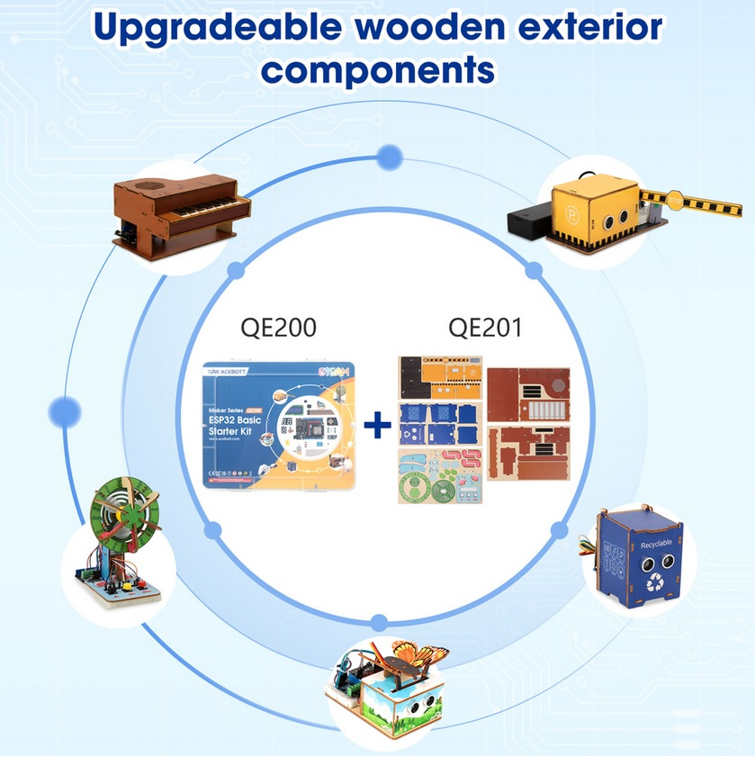 ✅ Do zestawu można zakupić oddzielnie zestaw Wooden Board for ESP32 (QE201) to moduły konstrukcyjne, panele drewniane wykonane ze sklejki, elementy obudowy do zestawu edukacyjnego ESP32 QE200.